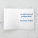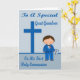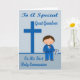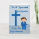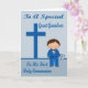 Congratulate your great grandson on his First Holy Communion with an adorable boy dressed in a blue suit with a bow tie and cute, pink flower on his lapel holding a Holy Bible. Background is blue with a dark blue cross and text.