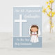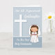 Congratulate your special goddaughter on her First Holy Communion with an adorable girl dressed in a white gown with a flower veil, pink buttons and a pink belt. Background is blue with a white cross with light blue shading and white text.