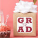 GRAD in bold crimson red letters fills the corners of these grad square stickers. Congratulations above the name of your graduate and the Class of below. SEE ENTIRE COLLECTION of pre-done colour combinations, invitations, paper plates, napkins, signs and more in our store.