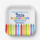 This adorable 2026 kindergarten graduation party paper plate features a cool grad cap above colorful writing and a row of crayons in rainbow. Cute customizable kindergartener graduate decor in fun colors for the last day of elementary school with your kid's name personalized in blue. Congratulations to our kinder grad!