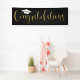 Stylish graduation party banner features "Congratulations" in trendy gold coloured calligraphy script with white grad cap and modern custom text for the graduate's name and class year. Black background colour can be modified.