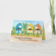A congratulations greeting card for a new beach house featuring three bright cheerful houses with a smooth sandy beach in front and palm trees decorating the yards illustrated with watercolor. On the inside is a warm shade of yellow with black text which can be edited to fit your needs.