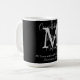 This elegant minimalist fun Retirement Congratulations Coffee Mug has a solid black background, grey monogram, and white script text. Easy to personalise, just change or delete example name, monogram, and text. Great gift for a retiree. All Rights Reserved © 2025 Alan & Marcia Socolik.