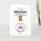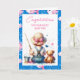 Congratulations on your new baby girl fishing themed new baby card. An adorable sweet little ai watercolor illustration of a baby girl in cute suspenders fishing with a teddy bear. The colours of this invitations include blue and pink. Inside is a little pink fish in a water bucket. On the back is a little pink fish in a fishtank.