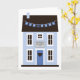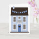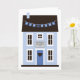 Home Sweet Home Congratulations Card | A modern congrats on your new home card with a simple vector drawing of a blue house, bunting with the words "NEW HOME" and the couples name on a plaque above the door.