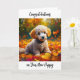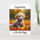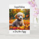 Cute Apricot poodle puppy dog playing in yellow fall leaves greeting card. Congratulations on your new puppy.