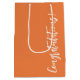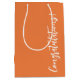 A simple orange gift bag with "Congratulations" in chic lettering vertically on both sides makes a perfect accessory for gift giving.