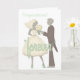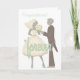 The front of this wedding congratulatory greeting card shows a groom presenting a bouquet of flowers to his bride. Across the image is written in mint green "forever". At the top is your custom text in mint green. The inside left has a cute image of a car decorated with "Just Married" and trailing tin cans. The inside right has your custom text in grey, and two mint green hearts. Personalise it, or make it say whatever you'd like! *Clip art used in this design is copyrighted by Encore Software, Inc., which permits use to its licensors. All rights reserved.