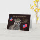Congratulate your grandson on completing basic training with an adorable racoon smiling, wearing a military hat next to an American flag and a cute star. Background is a pretty burgundy. Let them know how proud we are of them and how much they are appreciated.