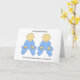Two adorable twin babies in blue outfits with the words 'Congratulations you're Grandparents to twins!'