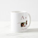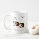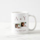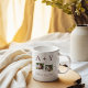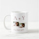 Two-photo layout linked by a dotted line design with rose taupe initials above and soft script quote below. White base with minimal layout creates a clean and thoughtful expression. A modern neutral-toned photo mug design for meaningful moments.