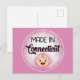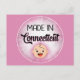 This funny postcard features a cute white baby face that says "Made In Connecticut" on a Pink background. Perfect for new baby announcements or just for fun.