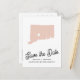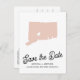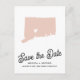 Modern CONNECTICUT State Destination wedding save the date with CONNECTICUT State silhouette in blush pink with with heart, save the date in a contemporary font and your name and wedding date along the bottom. On the back a space for a custom message and your return address.