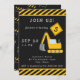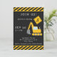 Celebrate your little one's special day with this custom boy birthday invitation with an adorable construction theme. The invitation has an excavator, a yield sign, and a road work safety divider. There are also yellow and black stripes. Add your child's name, age, party location, date, time, and RSVP info.