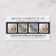 Highlight four photographs of your work in this crisp and clean, eyecatching business card design for developers or trades related companies. White background with easy to read black text, and 4 sample photos framed in white on a high contrast black stripe. Easily customisable to suit any profession.