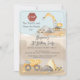 Created with a muted watercolor less traditional pallet, this 3rd Birthday Party design features a dump truck and a backhoe-excavator on a construction site with the caption "Stop the Traffic and Close the Roads for" your child's birthday. The muted pallet is continued on back with a charcoal grey and softer yellow diagonal striped pattern. Composite design by Holiday Hearts Designs (rights reserved).