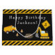 Celebrate your little one's special day with this custom boy gift bag with an adorable construction theme. The gift bag has a dump truck and excavator working together at a road construction site. There are also orange traffic cones, a dirt pile, and yellow and black stripes. Add your Happy Birthday greeting and your child's name and age for a special touch!