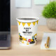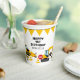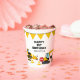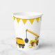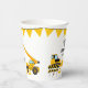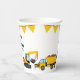 Construction birthday party paper cups featuring a simple white background, with cute cartoon illustrations of bunting, stop signs, a dump truck, a digger, a wrecking ball crane, splatters of dirt, and a happy birthday template that is easy to personalise.