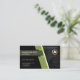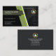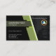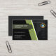 Design features a worker at a construction site at the right face of the card. At the top of this artwork is the faux gold logo and its business name. Over to the left, there are three slanting vertical columns of white and greens. Near the midsection, a darker green column houses your prestigious name and job title. Directly underneath are the slogan option and contact details.
