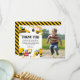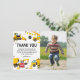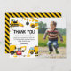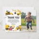 Construction themed birthday thank you cards featuring a simple white background, a photo of the child, cute cartoon illustrations of bunting, stop signs, a dump truck, a digger, a cement truck, a wrecking ball crane, splatters of dirt, and a modern thank you template that is easy to personalise.