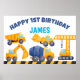 Construction trucks boys birthday party banner. Yellow and blue colour digger, crane, dump truck, cement mixer and loader trucks.