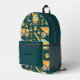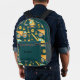 This rugged backpack features a cool all-over print on a dark green background, covered with a dynamic pattern of excavators, dump trucks, and road signs in bold yellow and orange tones. The customizable name "Benjamin" on the front pocket adds a personal touch, matching the black hardware for a sleek, coordinated look.