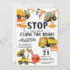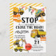This design features four classic construction trucks in bold yellow arranged together on a brown and black background. It includes other construction items like guard rails and traffic cones and black and yellow traffic stripes. We have you covered for a construction trucks themed party: supplies, decor, delicious treats and meaningful personalised gifts!