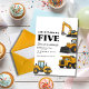 Featuring bold typography and bright construction vehicles like dump trucks, excavators, and rollers, this design is perfect for a construction-themed birthday party.