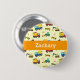 A cute and colourful construction vehicles theme pattern pin it button for the boys. The pattern is make up of lots of construction elements like a red and yellow dump truck carrying the debris, an orange excavator, a green front loader pushing dirt, a blue and yellow concrete mixer, orange and white cones and a yellow and black construction zone barrier. Personalise child's name within space available. Perfect for boys who love construction vehicles, toys and machines!