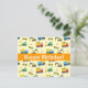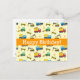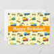 If the birthday boy loves construction theme vehicles and machines, he will be delighted to receive this happy birthday postcard. It comes with a construction vehicles theme pattern that is created using construction elements like a red and yellow dump truck carrying the debris, an orange excavator, a green front loader pushing dirt, a blue and yellow concrete mixer, orange and white cones and a yellow and black construction zone barriers.