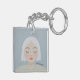 This minimalist portrait features a stylised face with a calm, meditative expression. The woman has white hair framing a pale face with rosy cheeks and coral lips. Eyes closed, the figure exudes a sense of inner peace and tranquillity. Set against a soft blue-grey background, the muted colour palette and clean lines create a soothing, modern aesthetic, adding a touch of zen. Personalise with a name.