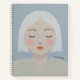 This minimalist portrait features a stylised face with a calm, meditative expression. The woman has white hair framing a pale face with rosy cheeks and coral lips. Eyes closed, the figure exudes a sense of inner peace and tranquillity. Set against a soft blue-grey background, the muted colour palette and clean lines create a soothing, modern aesthetic, adding a touch of zen. Personalise with a name.