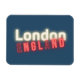 Modern typographic design features "London England" in red and white neon text on dark blue background