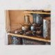 A nice old stove with so much going on it's hard to tell what to serve first. Pots, pans, kettles, pies... So much food!