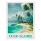 Illustrated poster of the Cook Islands featuring a peaceful beach with overwater bungalows, tall palm trees, and calm turquoise sea. Perfect wall art for a tropical and relaxing vibe.