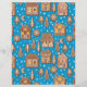 Hand drawn vector pattern featuring various gingerbread houses, fir trees, snowflakes and crescent moon-shaped cookies on blue with falling snow
