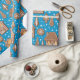 Hand drawn vector pattern featuring various gingerbread houses, fir trees, snowflakes and crescent moon-shaped cookies on blue with falling snow
