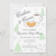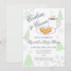 Cookies and cocoa gender neutral baby shower with gray snowflakes and winter green trees bordering a plate of chocolate chip cookies and a mug of hot chocolate