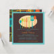 Retro style implements for cooking and eating are featured on this lovely invitation to a "stock the kitchen" Bridal Shower for the bride-to-be. The colour scheme is fun and cheerful in shades of teal, orange and green, set against a dark chocolate background. The contemporary styling is sure to please a modern bride.