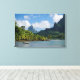 Canvas print of the tropical Cook's Bay with a boat and volcano background with palm trees and jungle on the island of Moorea, near Tahiti in the Pacific archipelago French Polynesia.