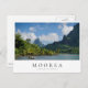 Photo postcard of the tropical Cook's Bay with a boat and volcano background with palm trees and jungle on the island of Moorea, near Tahiti in the Pacific archipelago French Polynesia with in a white box the text: 'Moorea, French Polynesia'.