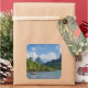 Square photo sticker of the tropical Cook's Bay with a boat and volcano background with palm trees and jungle on the island of Moorea, near Tahiti in the Pacific archipelago French Polynesia.