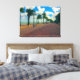 The original photograph by ZoeSPEAK on this Stretched Canvas Print is a landscape of the promenade along the beach in Hollywood, Florida. The weather is cool and breezy, the beach is empty, and only a few people can be seen on the walkway in the distance. The palm trees are bending away from the water, and the tropical blue sky is filled with puffy white clouds.
