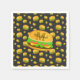 Cool and fun burger pattern on dark grey background. Yummy vector illustration made with toasty sesame bun with meat patty, salad, tomatos and cheese.