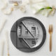 Sunlight illuminates the background building, the square panes of its rectangular windows a mix of light and dark reflections. The shadowed foreground wall draws your eye through to the details of the black and white photo.
