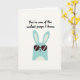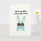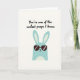 Designed with a soft, modern look, this Easter card features a stylized bunny in robin’s egg blue lounging across the lower half of the front 🐰. Pale blue accents fill the long ears and a small belly patch, while the simple shapes give it an easy, friendly charm. Dark rectangular sunglasses sit high on its face, with thin white reflections that suggest bright spring light and a confident, flirty attitude. Beneath the shades, a tiny black “x” nose and mouth adds a relaxed expression, like it’s sharing an inside joke with someone special 🐇. Centered above the bunny, the message “You’re one of the coolest peeps I know” appears in casual black lettering that feels like a note from a close friend. The background stays off-white and uncluttered, keeping the focus on the blue character and the dark text. A few narrow white highlight lines glint across the sunglasses, standing out against the deep black frames. Share warm Easter sentiments with someone you care about.