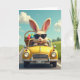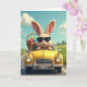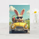 This design shows a fluffy, human-like rabbit riding in the center of a cheerful yellow, vintage-style car, heading down a country road with a calm, confident air 🐰. The rabbit’s tall ears are lined in soft pink, and dark sunglasses tilt slightly as it looks ahead, as if driving toward someone it can’t wait to see. Its small paws rest on the steering wheel in a gentle, steady grip, giving the scene a friendly, affectionate energy rather than a rushed trip. In the back seat, a woven basket sits snugly, filled with smooth eggs in bright blue, red, green, and orange, like a colorful surprise meant to be shared 🌷. Above the illustration, a short Easter greeting appears in simple lettering, centered near the top in a soft pastel tone that stands out against the sky. The car’s rounded body and shiny silver details catch the sunlight, adding a cozy, nostalgic touch to the ride. A wide blue sky with puffy white clouds stretches overhead, while green fields and distant trees line the winding gray road.