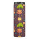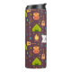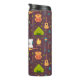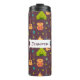 A thermal water bottle with a fun camping themed pattern. Set on a reddish brown background. Elements in the pattern include a campfire, a tent,. a guitar, a shovel and backpack. Personalise with a name.