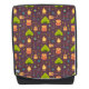 A backpack designed with a cute camping pattern. Camping themed items such as an orange campfire, a green tent, an acoustic guitar and other nature