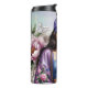 A stylish figure with long, dark, wavy hair and a purple baseball cap holds an iced coffee with both hands, showcasing manicured nails. She wears a blue tube top and a purple floral jacket draped over her shoulders. Large, soft purple and white peonies and subtle shimmering accents form a cool and casual background.